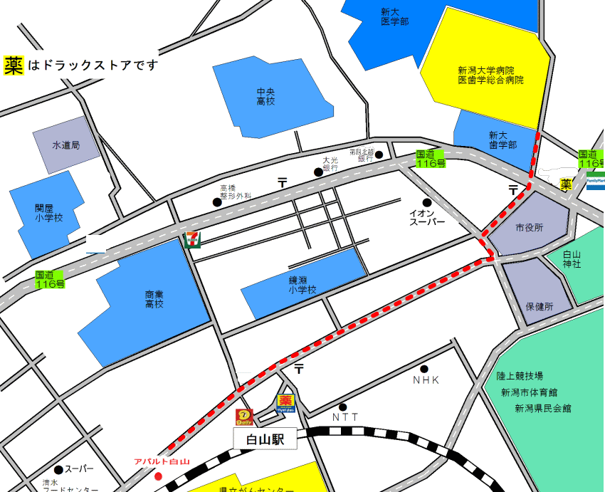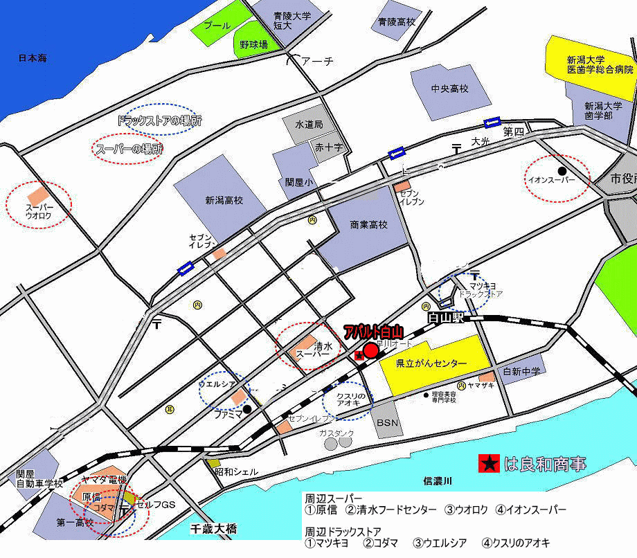 | 徒歩圏内に白山駅や清水フードセンター、ドラックストア、コンビニ、銀行、新潟駅行きのバス停があります | ||
