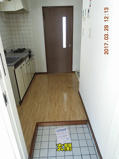 | 玄関部分 靴箱はありません。 キッチンには窓があり換気などできます。 2口ガスコンロ付属 |